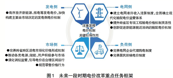 國家能源局組織發(fā)布的《新型電力系統(tǒng)發(fā)展藍皮書》提出,電價機制等配套政策與體制機制,是構(gòu)建新型電力系統(tǒng)的制度保障,是充分發(fā)揮市場在資源配置中的決定性作用、推動有效市場和有為政府相結(jié)合的關(guān)鍵支撐;新型電力系統(tǒng)構(gòu)建過程中,需注重發(fā)揮電價機制的關(guān)鍵引導作用。適應(yīng)新型電力系統(tǒng)構(gòu)建的電價改革是一項系統(tǒng)性工程,涉及電力系統(tǒng)各個環(huán)節(jié);圍繞政府定價和市場定價兩條主線,按照“發(fā)現(xiàn)價格、促進轉(zhuǎn)型、保障供應(yīng)、健全市場”的改革目標,研究提出了未來一段時期電價機制改革重點任務(wù)框架(見圖1)。