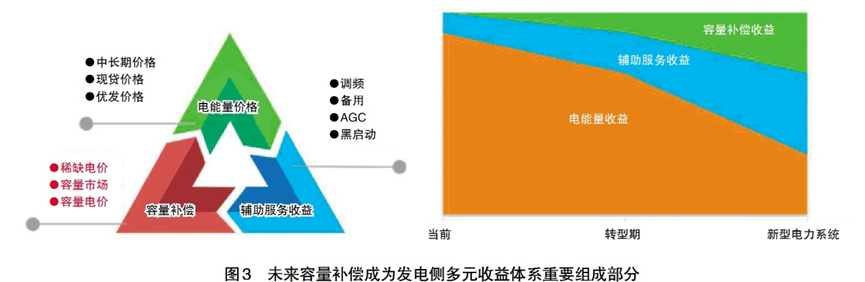 發(fā)電側(cè)容量補償機制。目前,國家僅針對煤電建立了容量電價機制,補償水平主要為每年100元/千瓦和165元/千瓦,但長期來看,建立煤電容電價機制可能引導電能量市場價格下行,不利于其他電源品類回收成本。隨著電力市場加快建設(shè)發(fā)展,電力市場應(yīng)有效發(fā)現(xiàn)電源的電能量價值、輔助服務(wù)價值和容量價值。建議適時建立健全覆蓋發(fā)電側(cè)各電源品類的、與電力市場有效銜接的容量電價機制或容量市場機制,通過市場化方式有效體現(xiàn)各類電源對系統(tǒng)的支撐調(diào)節(jié)容量價值,保障發(fā)電側(cè)長期容量充裕性(見圖3)。
