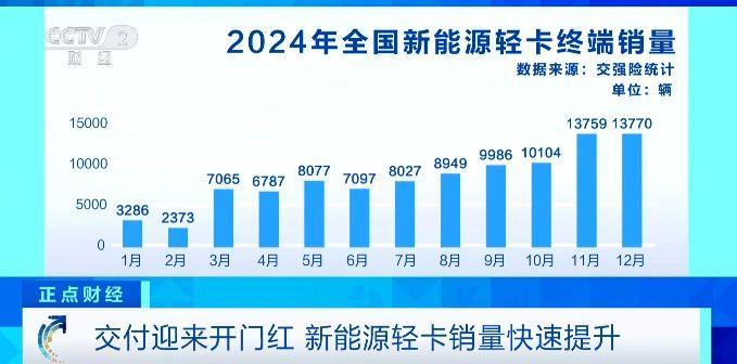 2025年1月,我國新能源輕卡市場實(shí)銷4637輛,同比增長41%,創(chuàng)下歷年來最佳首月表現(xiàn)。記者梳理發(fā)現(xiàn),2024年,我國新能源輕卡市場累計(jì)銷量近10萬輛,全年有7個(gè)月銷量超過8000輛,并且自10月份起,連續(xù)3個(gè)月銷量突破一萬輛。