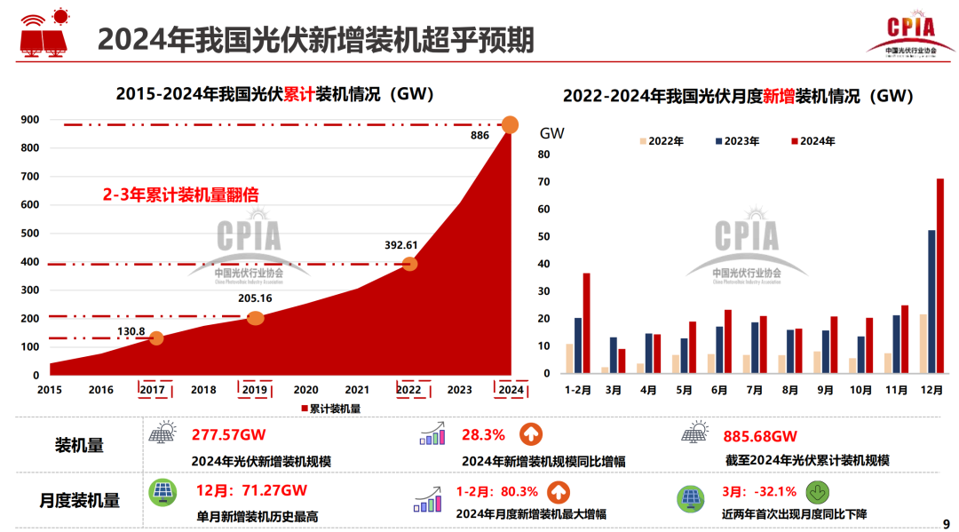 中國儲能網(wǎng)訊:“2024年我國光伏新增超乎預(yù)期,達277.57GW,同比增長28.3%,相當(dāng)于2010年到2020年11年的累計裝機量。截至2024年,我國光伏累計裝機突破880GW。”2月27日,中國光伏行業(yè)協(xié)會名譽理事長王勃華在“光伏行業(yè)2024年發(fā)展回顧與2025年形勢展望研討會”上指出。