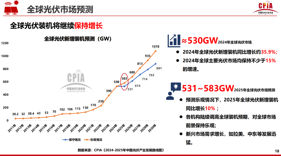 王勃華預(yù)測,2025年,全球光伏新增裝機531~583GW,樂觀情況下同比增長10%,我國新增裝機215~255GW。拉美、中東等新興市場發(fā)展迅猛,或?qū)硇碌臋C遇。