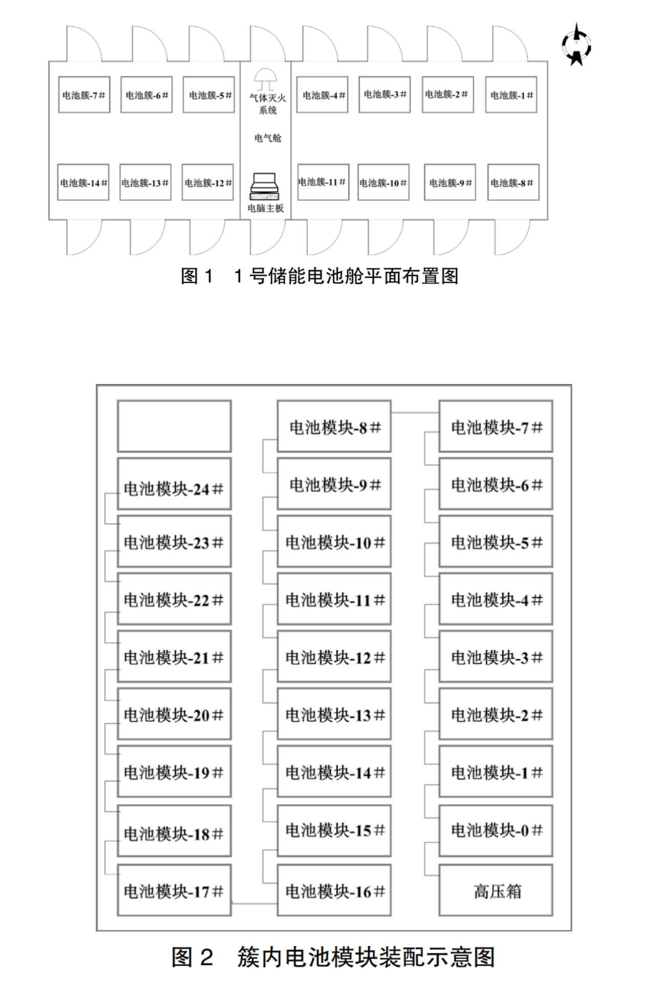 該儲能電站設有4座集裝箱式儲能電池艙及儲能升壓一體艙,由北向南依次布置,分別編號為1~4號。每座儲能電池艙長13.7m、寬2.43m、高2.95m,南、北兩側(cè)共設有16個箱門,每個箱門對應一簇電池組,其中北側(cè)由東向西設有1~7簇電池組,南側(cè)由東向西設有8~14簇電池組;中間部位設有電氣艙,電氣艙內(nèi)北側(cè)為氣體滅火系統(tǒng)、南側(cè)為電腦主機裝置(見圖 1)。每簇電池組內(nèi)裝配有25個電池模塊(見圖2),每個電池模塊又包括16個磷酸鐵鋰電池芯,該磷酸鐵鋰電池芯型號為BQ280-16S、容量280Ah、額定電壓3.2V、滿電電壓3.65V,上述每簇電池組內(nèi)25個電池模塊之間、每個電池模塊16個電池芯之間均為串聯(lián),簇與簇之間為并聯(lián)。此次起火艙室為1號儲能電池艙。