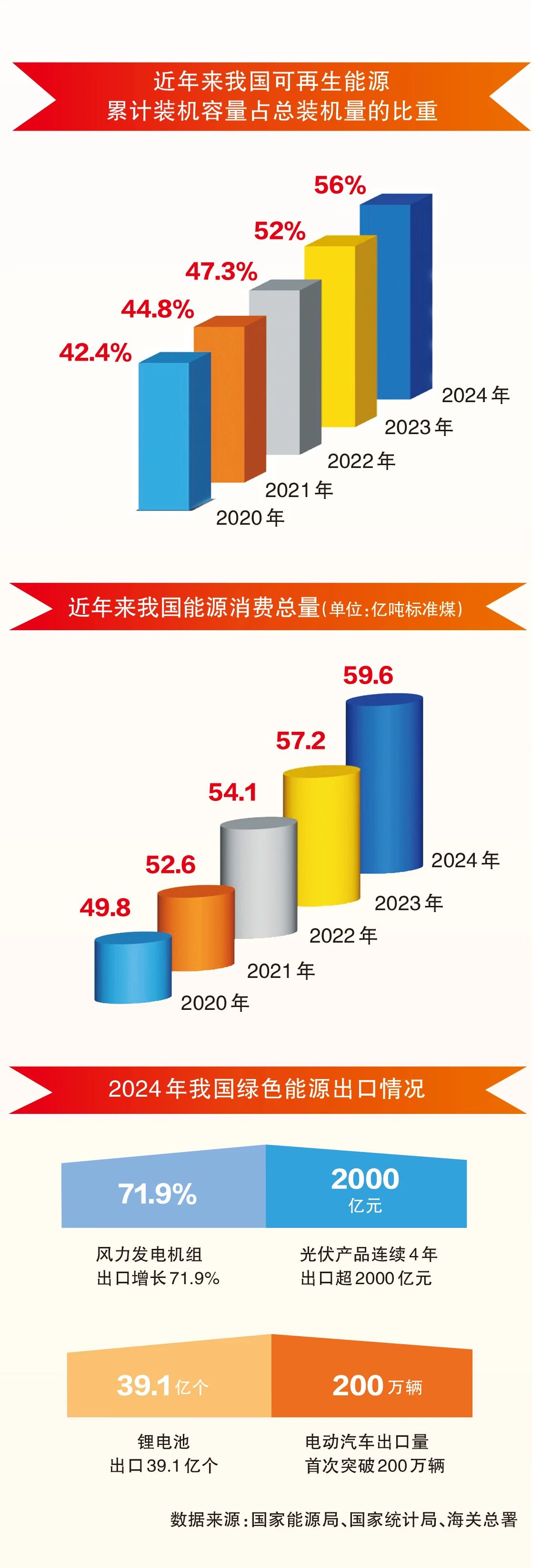 2024年,我國風(fēng)力發(fā)電機(jī)組出口增長71.9%;光伏產(chǎn)品連續(xù)4年出口超2000億元;鋰電池出口39.1億個(gè);電動(dòng)汽車出口量首次突破200萬輛,創(chuàng)歷史新高。我國的綠色貿(mào)易領(lǐng)跑全球。能源成為我國外貿(mào)的重要領(lǐng)域之一,拉動(dòng)總量、增量、質(zhì)量“三量”齊升。