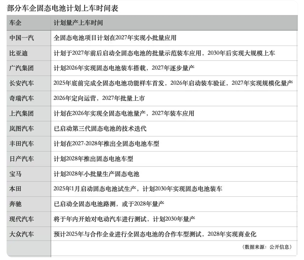 據(jù)新京報(bào)貝殼財(cái)經(jīng)記者不完全統(tǒng)計(jì),目前已有十余家主流車企明確固態(tài)電池上車時(shí)間表,2027年成為關(guān)鍵上車節(jié)點(diǎn)。