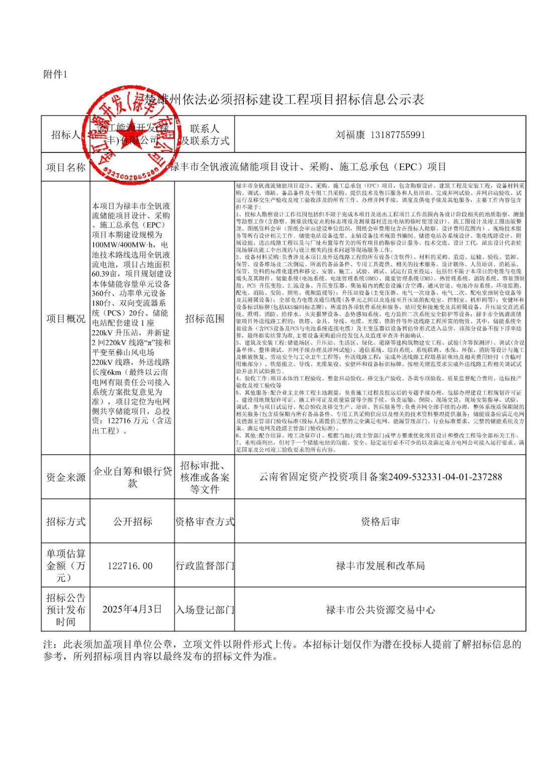 中國儲(chǔ)能網(wǎng)訊:3月3日,云南省公共資源交易信息網(wǎng)發(fā)布祿豐市全釩液流儲(chǔ)能項(xiàng)目設(shè)計(jì)、采購、施工總承包(EPC)項(xiàng)目招標(biāo)計(jì)劃,總投資:122716萬元(含送出工程),折合單價(jià):3.0679元/Wh,該招標(biāo)公告預(yù)計(jì)于2025年4月3日發(fā)布。