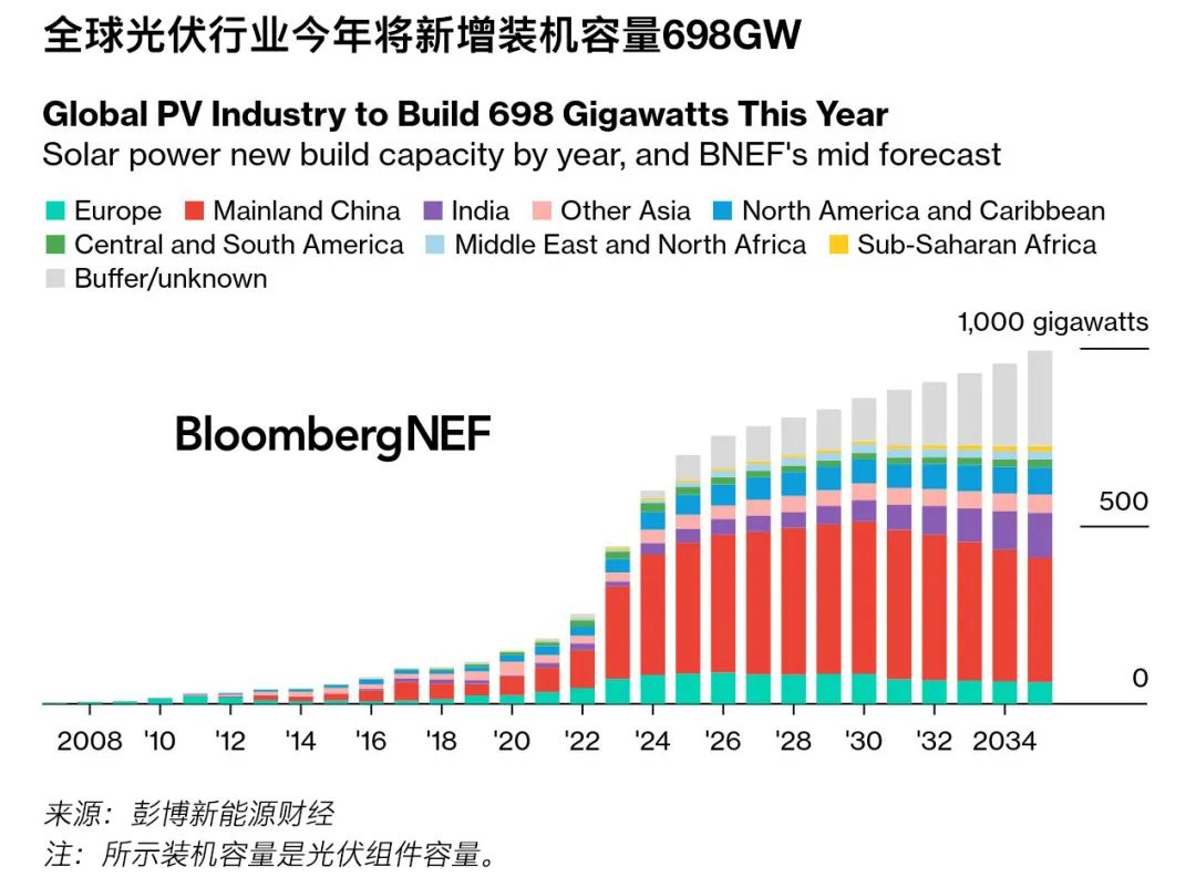 預(yù)計(jì)2025年光伏新增裝機(jī)容量將比2024年增長(zhǎng)17%,達(dá)到698GW。彭博新能源財(cái)經(jīng)現(xiàn)在對(duì)2025年的預(yù)測(cè)較2024年底高出5%。去年,彭博新能源財(cái)經(jīng)的預(yù)測(cè)低于中國(guó)、印度、巴西和許多較小市場(chǎng)的最終官方數(shù)字。