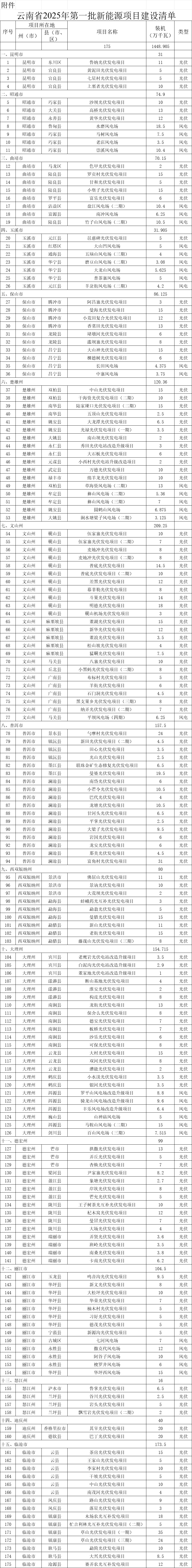 中國(guó)儲(chǔ)能網(wǎng)訊:3月3日,云南省發(fā)展和改革委員會(huì)、云南省能源局發(fā)布《關(guān)于印發(fā)云南省2025年第一批新能源項(xiàng)目開(kāi)發(fā)建設(shè)方案的通知》(以下簡(jiǎn)稱:通知)。根據(jù)通知,共175個(gè)項(xiàng)目納入2025年第一批,總規(guī)模為1448.905萬(wàn)千瓦,包含光伏項(xiàng)目143個(gè),裝機(jī)1203.4萬(wàn)千瓦;風(fēng)電項(xiàng)目32個(gè),裝機(jī)245.505萬(wàn)千瓦。