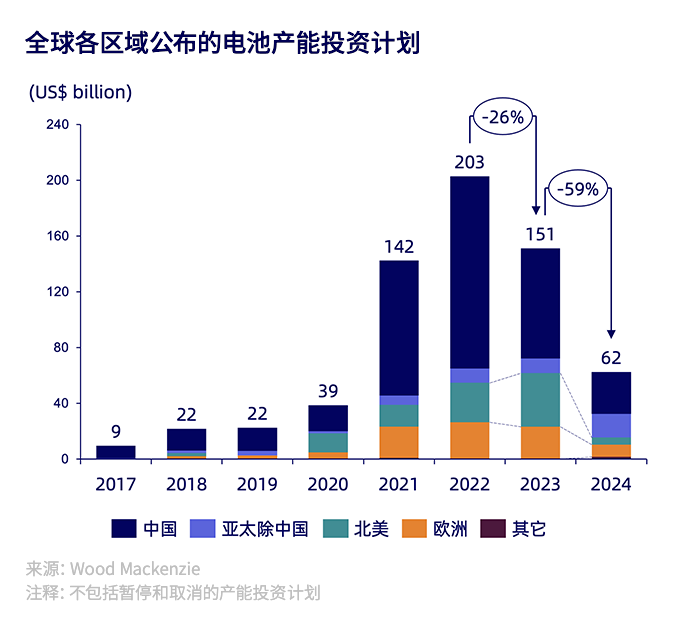 2024年,全球電池產(chǎn)能投資總額降至620億美元,降幅達(dá)59%。其中,美國和歐洲的投資額分別下降了87%和60%。而亞太地區(qū)(除中國外)則成為了唯一實(shí)現(xiàn)增長的地區(qū),其中印度、印度尼西亞和馬來西亞展現(xiàn)出了巨大的發(fā)展?jié)摿Α?/span>