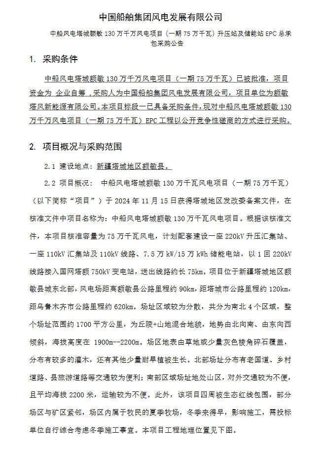 中國儲能網(wǎng)訊:近日,中國船舶集團(tuán)發(fā)布中船風(fēng)電塔城額敏130萬千萬風(fēng)電項(xiàng)目(一期75萬千瓦)升壓站及儲能站EPC采購。該項(xiàng)目位于新疆塔城地區(qū)額敏縣,由額敏塔風(fēng)新能源有限公司投資建設(shè)容量為1300MW風(fēng)電項(xiàng)目,本期建設(shè)750MW風(fēng)電及儲能,配置儲能容量為風(fēng)電裝機(jī)的10%/2小時(shí),總規(guī)模為75MW/150MWh。
