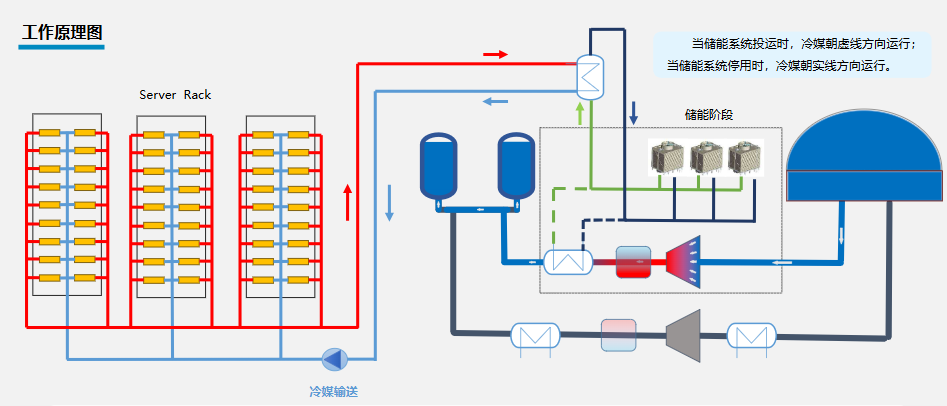 數(shù)據(jù)中心液冷系統(tǒng)中的冷媒吸收芯片散熱后溫度升高,通過管路循環(huán)進(jìn)入二氧化碳儲能系統(tǒng)的釋能階段蒸發(fā)器,與二氧化碳進(jìn)行換熱。冷卻后的冷媒重新進(jìn)入數(shù)據(jù)中心機柜,持續(xù)為芯片散熱,形成完整的冷卻循環(huán)。這一過程實現(xiàn)了數(shù)據(jù)中心冷卻需求與儲能系統(tǒng)用熱需求的高效匹配,充分利用了數(shù)據(jù)中心的廢熱資源。