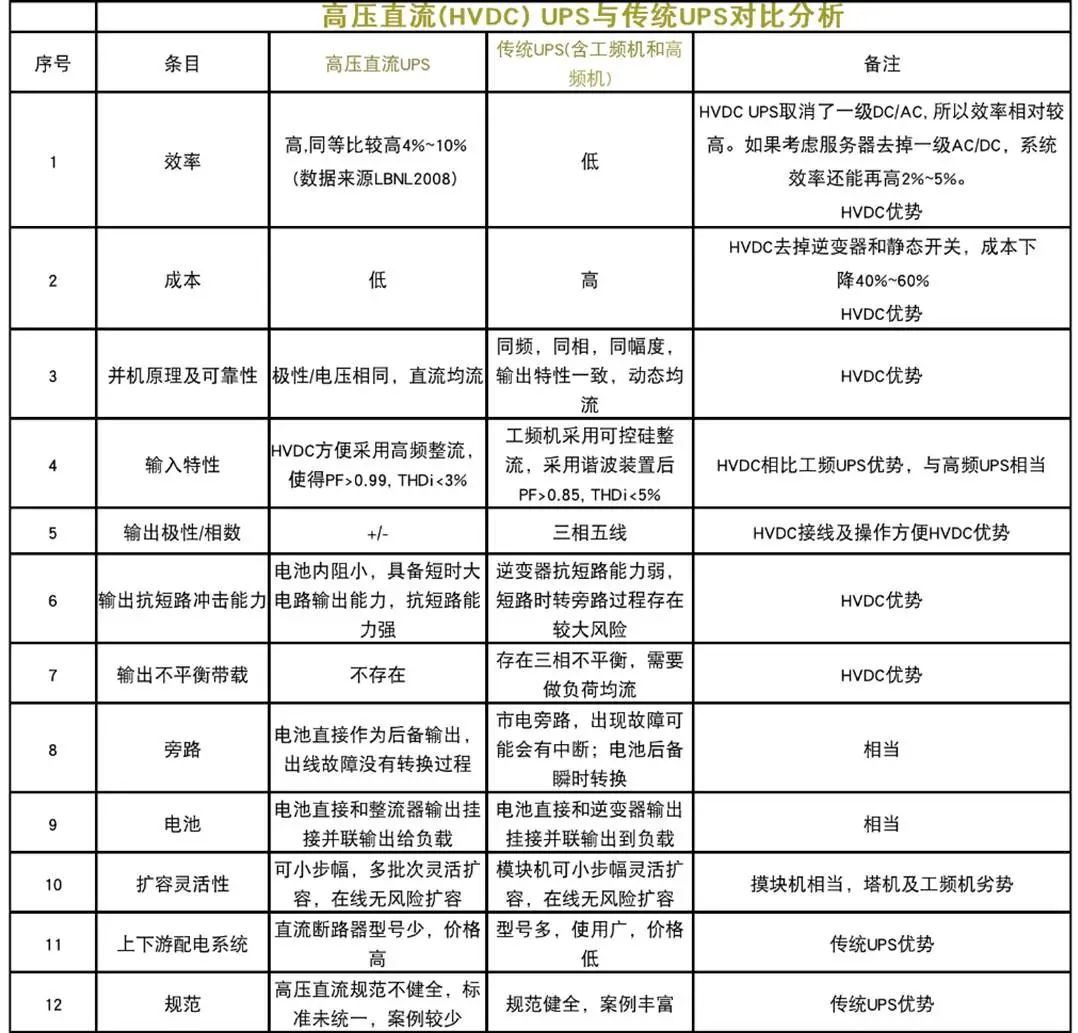 HVDC與傳統(tǒng)UPS對比分析(數(shù)據(jù)來源:@知乎飲冰子)