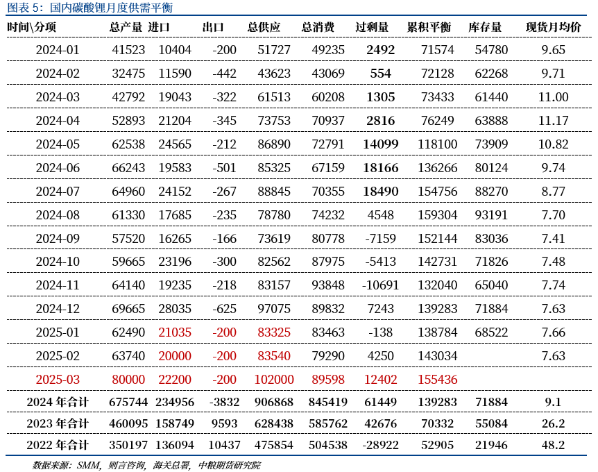 2025年2-3月,國(guó)內(nèi)碳酸鋰供給端增長(zhǎng)預(yù)期明確。節(jié)前,國(guó)內(nèi)碳酸鋰排產(chǎn)因季節(jié)性因素減產(chǎn),減產(chǎn)幅度正常。節(jié)后,宜春頭部企業(yè)停產(chǎn)項(xiàng)目陸續(xù)復(fù)產(chǎn),疊加西部鋰輝石項(xiàng)目復(fù)產(chǎn)和新項(xiàng)目爬產(chǎn),國(guó)內(nèi)碳酸鋰產(chǎn)量快速創(chuàng)新高。按SMM周度產(chǎn)量數(shù)據(jù)推算,預(yù)計(jì)3月國(guó)內(nèi)碳酸鋰產(chǎn)量將超8萬噸。