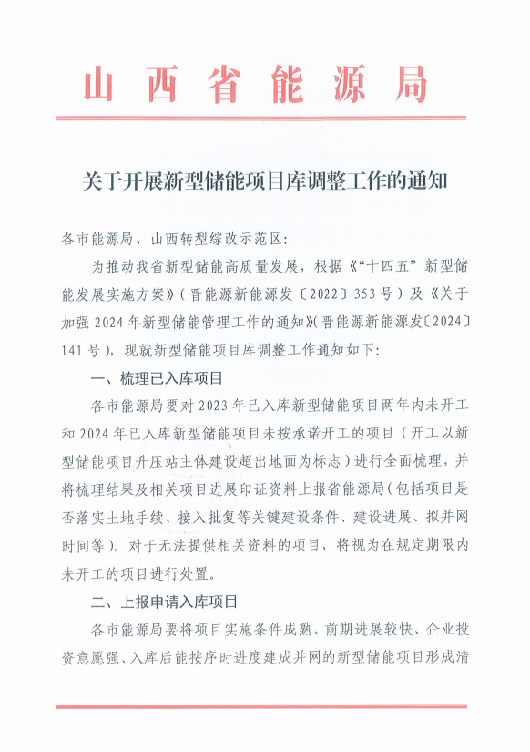 《關(guān)于開(kāi)展新型儲(chǔ)能項(xiàng)目庫(kù)調(diào)整工作的通知》表示各市能源局要對(duì)2023年已入庫(kù)新型儲(chǔ)能項(xiàng)目?jī)赡陜?nèi)未開(kāi)工和2024年已入庫(kù)新型儲(chǔ)能項(xiàng)目未按承諾開(kāi)工的項(xiàng)目(開(kāi)工以新型儲(chǔ)能項(xiàng)目升壓站主體建設(shè)超出地面為標(biāo)志)進(jìn)行全面梳理,并將梳理結(jié)果及相關(guān)項(xiàng)目進(jìn)展印證資料上報(bào)省能源局(包括項(xiàng)目是否落實(shí)土地手續(xù)、接入批復(fù)等關(guān)鍵建設(shè)條件、建設(shè)進(jìn)展、擬并網(wǎng)時(shí)間)。對(duì)于無(wú)法提供相關(guān)資料的項(xiàng)目,將視為在規(guī)定期限內(nèi)未開(kāi)工的項(xiàng)目進(jìn)行處置。
