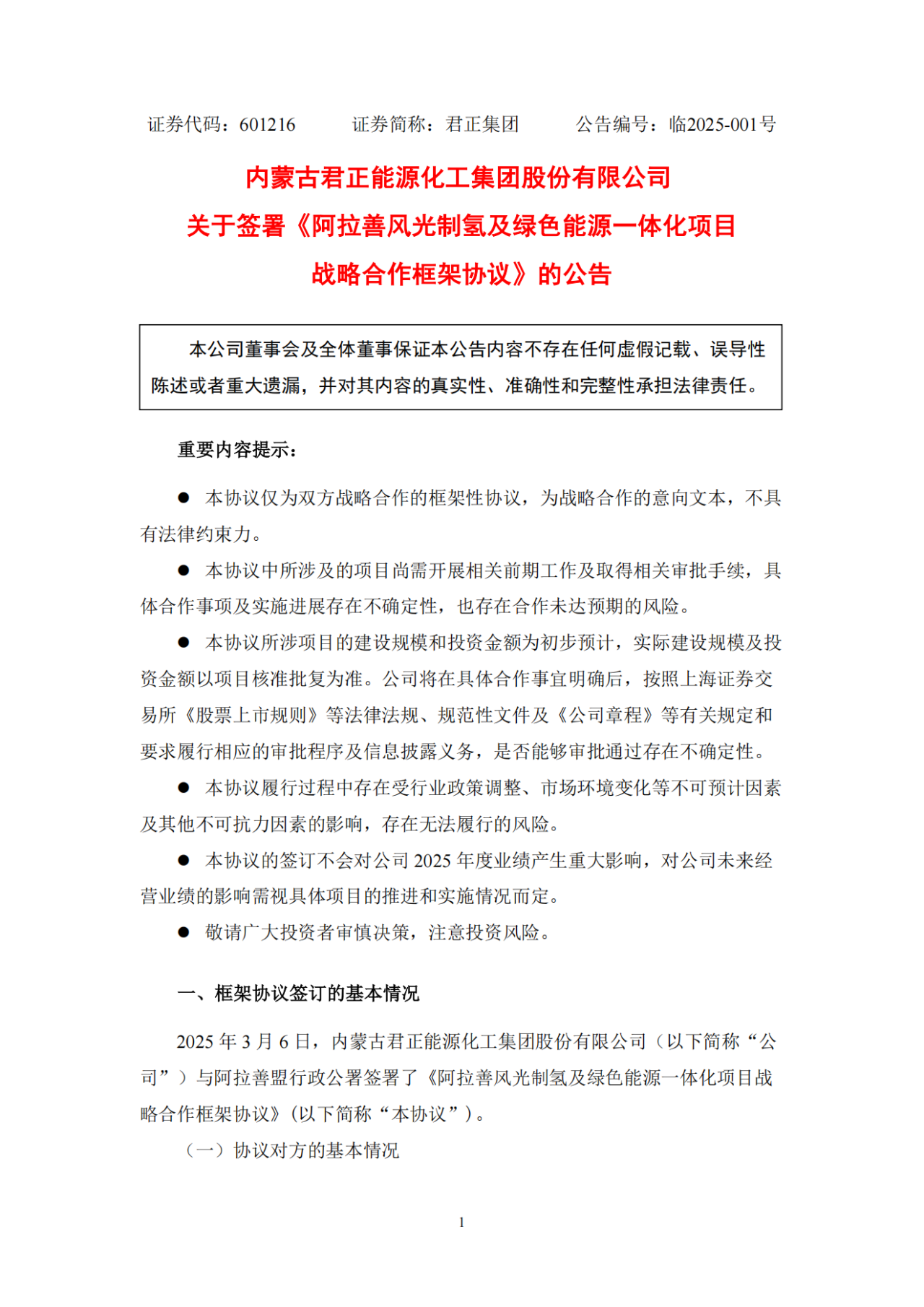 中國(guó)儲(chǔ)能網(wǎng)訊:3月6日,內(nèi)蒙古君正能源化工集團(tuán)股份有限公司(簡(jiǎn)稱(chēng):君正集團(tuán))發(fā)布關(guān)于簽署《阿拉善風(fēng)光制氫及綠色能源一體化項(xiàng)目戰(zhàn)略合作框架協(xié)議》的公告。