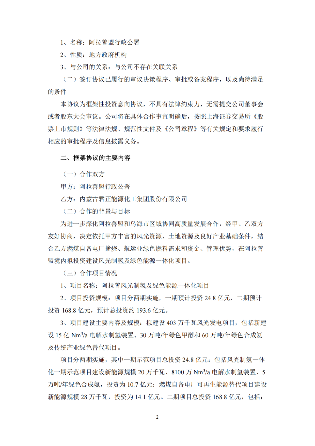 公告指出,為進(jìn)一步深化阿拉善盟和烏海市區(qū)域協(xié)同高質(zhì)量發(fā)展合作,經(jīng)甲、乙雙方友好協(xié)商,決定依托甲方豐富的風(fēng)光資源、土地資源及良好產(chǎn)業(yè)基礎(chǔ)條件,結(jié)合乙方燃煤自備電廠摻燒、航運(yùn)業(yè)綠色燃料需求和資金、管理優(yōu)勢(shì),在阿拉善盟境內(nèi)擬投資建設(shè)風(fēng)光制氫及綠色能源一體化項(xiàng)目。
