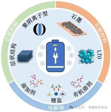 在低溫環(huán)境下,電解液電導(dǎo)率急劇下降,去溶劑化能增加,Li+在界面(SEI/CEI、活性材料)處的擴(kuò)散受阻,電荷轉(zhuǎn)移速率緩慢,導(dǎo)致LIBs的容量和壽命快速衰減。因此,寬溫域電解液研制、電極材料改性或電池結(jié)構(gòu)設(shè)計(jì)等是推動(dòng)低溫LIBs應(yīng)用的關(guān)鍵。針對(duì)上述問(wèn)題,目前,主要從電極材料改性和結(jié)構(gòu)設(shè)計(jì)以及調(diào)整溶劑、鋰鹽和添加劑等電解液組分來(lái)改善LIBs的低溫性能。