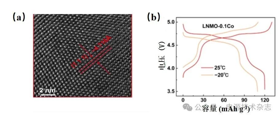圖3 LNMO-0.1Co的結(jié)構(gòu)特征(a)以及LNMO-0.1Co/Li在室溫和-20 ℃的首次充放電曲線[41](b)