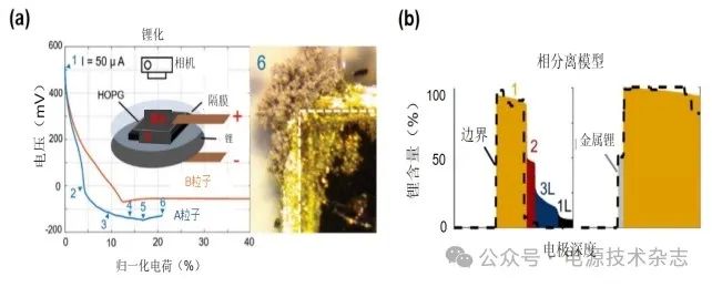 圖4 鋰化狀態(tài)下HOPG鋰插層和鋰沉積的電壓分布圖與相應(yīng)的HOPG顆粒邊緣平面圖像(a)以及基于相分離模型的石墨中鋰濃度分布[46](b)