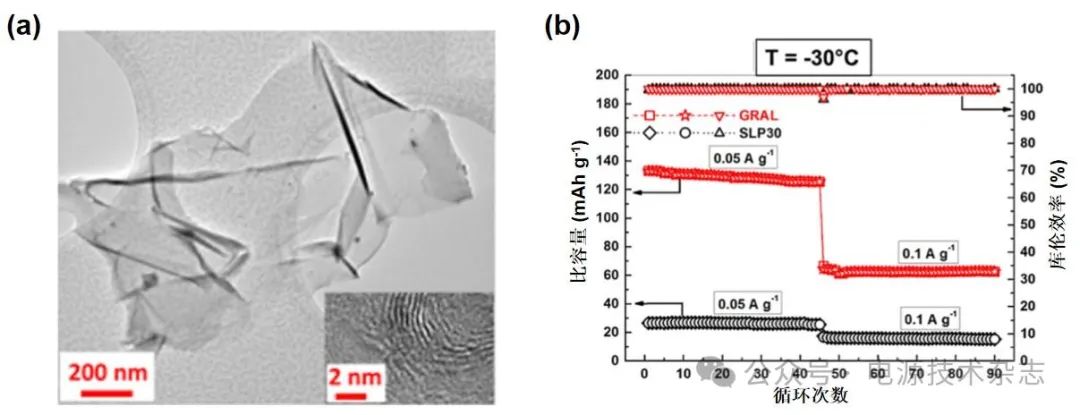 圖5 GRAL負(fù)極的透射電鏡圖像(a)以及與SLP30負(fù)極在-30 ℃下的電化學(xué)性能對(duì)比圖[56](b)