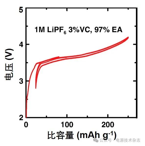 含有界面改性添加劑的酯基電解液,如乙酸乙烯酯(VC)、FEC等,是最常用添加劑。其中,VC是最常見(jiàn)的SEI成膜添加劑,并取得了有益的進(jìn)展。Song等[106]報(bào)道了VC添加劑能改善Li金屬沉積形態(tài)并提高循環(huán)穩(wěn)定性。Petibon等[107]研究了以VC作為唯一碳酸鹽成分的電解液,電池能夠在-14 ℃、4 C下保留40%的放電容量,而具有3%(質(zhì)量分?jǐn)?shù))VC的傳統(tǒng)EC/EMC電解液的電池在-14 ℃下不能以超過(guò)2 C的倍率放電,如圖7所示。