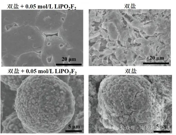 圖8 1 mol/L LiTFSI0.6-LiTFPFB0.4雙鹽電解液下,添加0.05 mol/L LiPO2F2到NMC 523/Li電池中負(fù)極形貌變化[108]