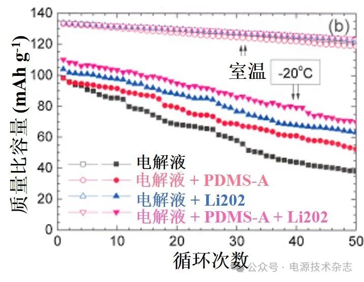 圖11 添加PDMS添加劑的鋰離子電池在室溫和?20 ℃的循環(huán)性能[109]