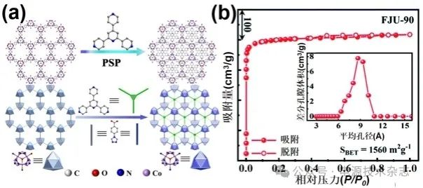 (a)FJU-88和改性后FJU-90的結構示意圖 (b)FJU-90的N2吸脫附等溫曲線,插圖為相應孔徑分布曲線[11]