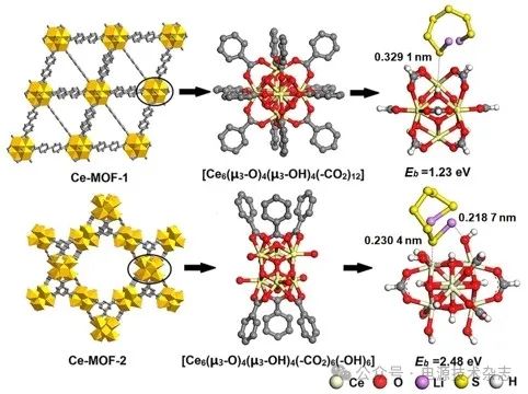 圖3 Ce-MOF-1和Ce-MOF-2的結構、金屬節(jié)點和Li2S6吸附位點[18]