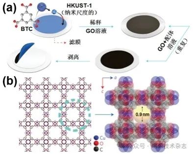 (a)MOF@GO隔膜的制備工藝示意圖 (b)HKUST-1微孔晶體結構示意圖[23]