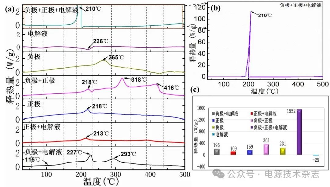 全文中所研究的熱觸發(fā)組件是指DSC測試的樣品組件,如:負極、正極、電解液、負極+電解液、正極+電解液、負極+正極、負極+正極+電解液。