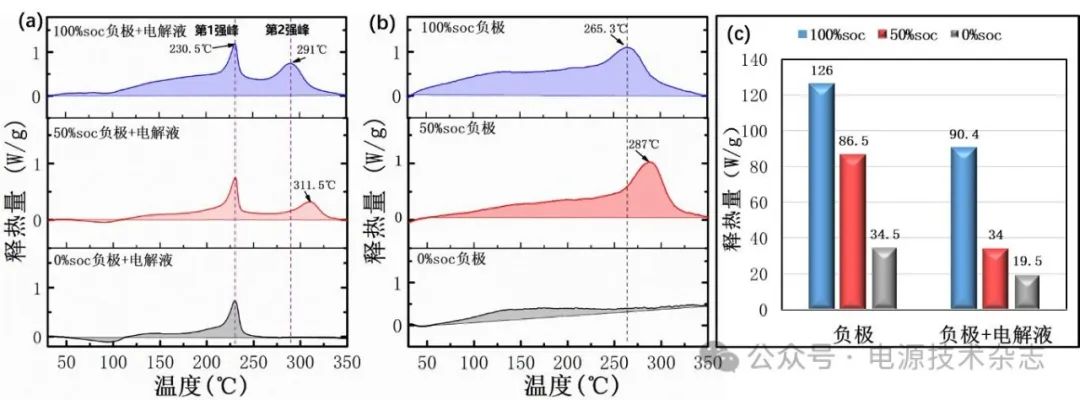 圖2 不同荷電態(tài)下的負極+電解液(a)、負極(b)的釋熱溫度時序以及不同荷電態(tài)下負極與負極+電解液的釋熱量對比圖(c)