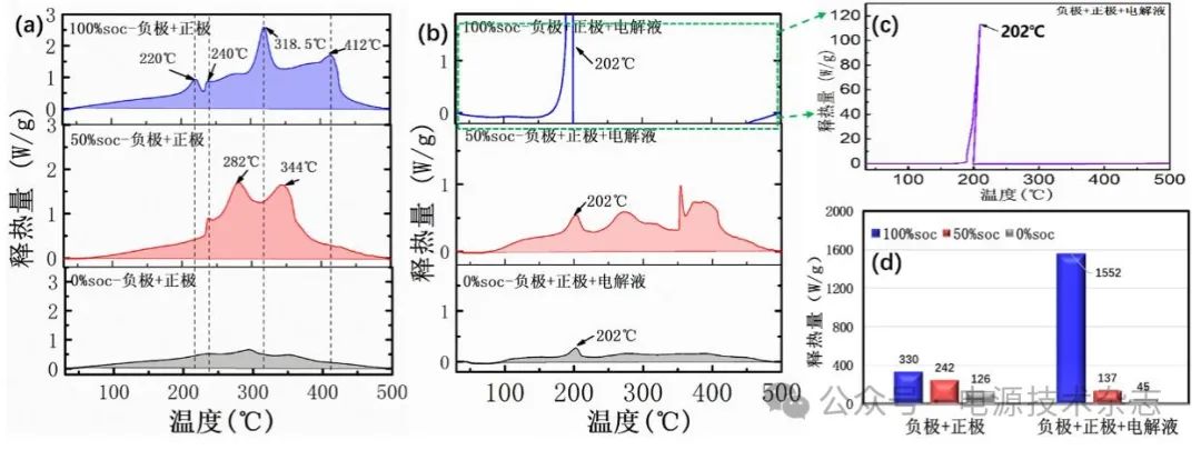 圖3 不同荷電態(tài)下的負極+正極(a)、負極+正極+電解液的釋熱溫度時序(b)、100% SOC負極+正極+電解液的全貌圖(c)以及不同荷電狀態(tài)下負極+正極與負極+正極+電解液的釋熱量對比圖(d)