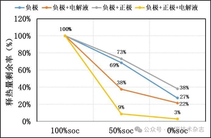 圖4 不同SOC下嵌鋰硅碳@石墨與其對應的電池各組件發(fā)生釋熱反應后的釋熱量剩余率對比圖