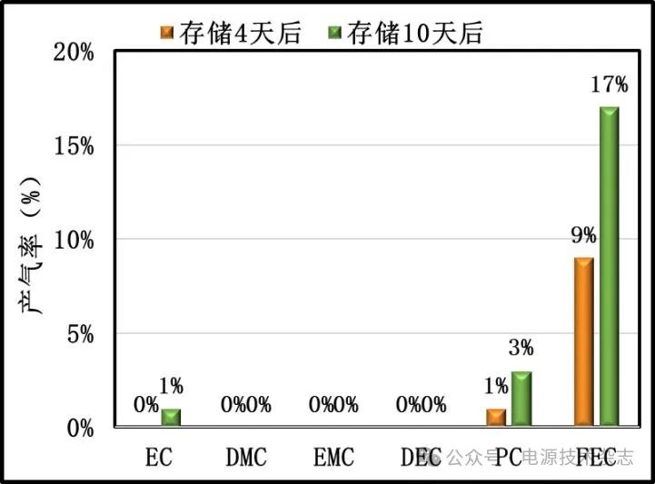 圖5 滿電SiC@石墨負極分別與不同電解液60 ℃下共存4天、10天的產(chǎn)氣率