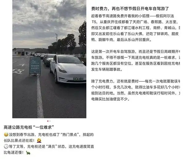 不少親身經(jīng)歷駕駛純電車輛春節(jié)出行的消費(fèi)者就抱怨“高速公路充電樁一位難求”“等了又等,充電樁還是滿員狀態(tài)”“甚至在服務(wù)區(qū)看到因搶充電樁發(fā)生車輛剮蹭事故”“除了充電費(fèi)力,還有就是費(fèi)時(shí),每充一次電就要耽誤半個(gè)小時(shí)行程”。對此,一位新能源汽車車主向中國經(jīng)濟(jì)網(wǎng)記者支招,“我長途自駕要充電又遇到節(jié)假日高峰時(shí)段時(shí),都會(huì)提前規(guī)劃好線路,下高速去充?!?/span>