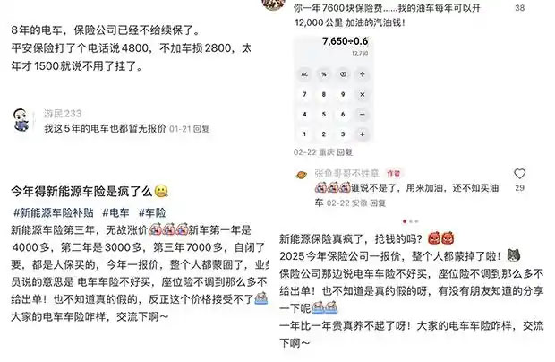 網(wǎng)絡(luò)上也有很多新能源汽車消費(fèi)者叫苦不迭?!?年的電車,保險(xiǎn)公司已經(jīng)不給續(xù)保了”“新能源車險(xiǎn)第三年,無故漲價(jià),新車第一年時(shí)4000多,第二年是3000多,第三年7000多”“一年比一年貴,真養(yǎng)不起了呀”。還有網(wǎng)友調(diào)侃,“你(新能源車)一年7600塊保險(xiǎn)費(fèi),我的油車每年可以開12000公里加油的汽油錢。”