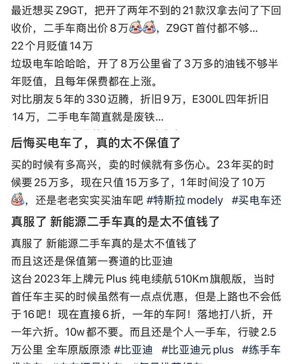 反映二手新能源車殘值低的網(wǎng)友不在少數(shù)?!?3年買的時(shí)候要25萬多,現(xiàn)在只值15萬多了,1年時(shí)間沒了10萬”“現(xiàn)在直接6這,一年的車啊”“22個(gè)月貶值14萬”。