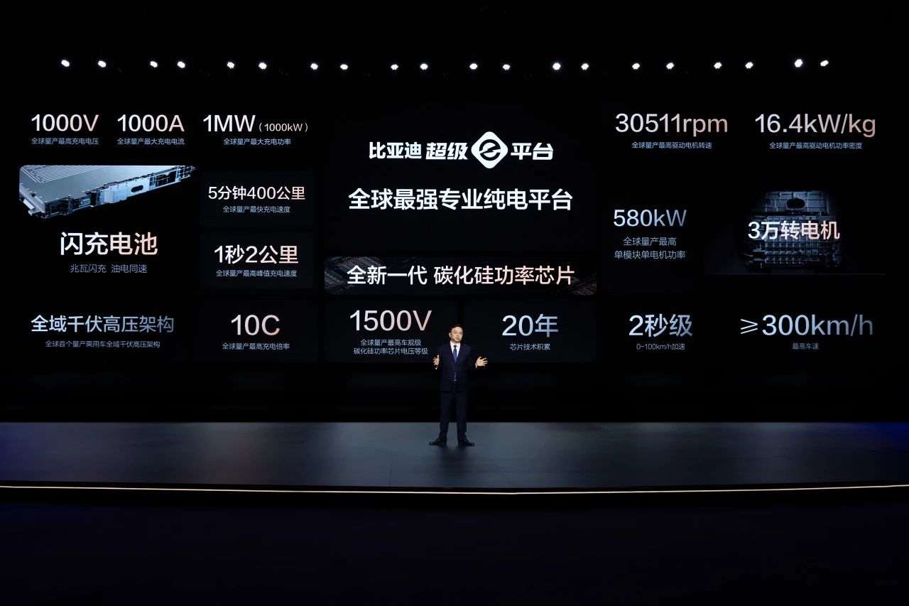 中國儲能網(wǎng)訊:2025年3月17日,比亞迪召開超級e平臺技術(shù)發(fā)布暨漢L、唐L預(yù)售發(fā)布會,發(fā)布劃時代超級e平臺,推出閃充電池、3萬轉(zhuǎn)電機(jī)和全新一代車規(guī)級碳化硅功率芯片,核心三電全維升級,刷新多項全球之最。在充電速度上,實現(xiàn)充電功率1兆瓦(1000kW),實現(xiàn)全球量產(chǎn)最高峰值充電速度1秒2公里,達(dá)到全球量產(chǎn)最快充電速度——閃充5分鐘,暢行400公里;在性能上,達(dá)到單模塊單電機(jī)功率580kW,最高車速超300km/h,定義全球最強(qiáng)專業(yè)純電平臺,首發(fā)搭載于劃時代旗艦漢L、唐L,即日起正式開啟預(yù)售,引領(lǐng)電動車下一個時代。