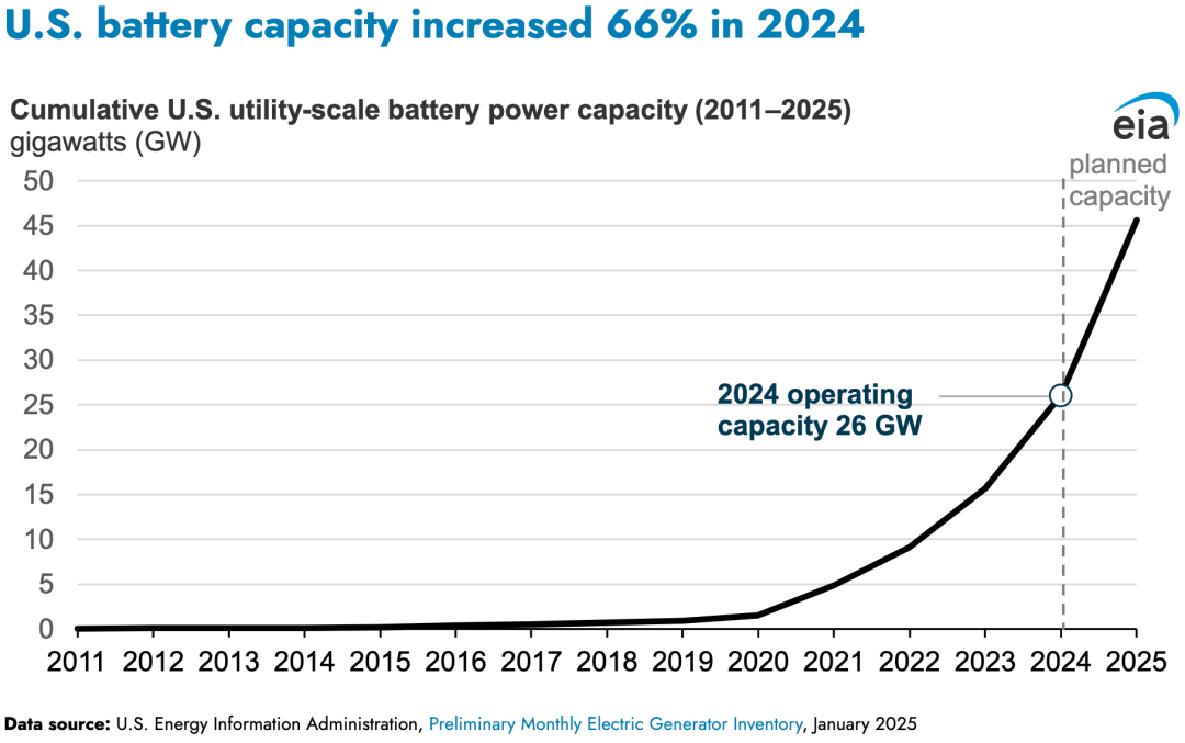 中國儲能網(wǎng)訊:根據(jù)美國能源信息署2025年1月的初步月度發(fā)電機組庫存數(shù)據(jù),在美國,截至2024年,美國累計公用事業(yè)規(guī)模的電池儲能容量已超過26吉瓦(GW)。2024年,美國發(fā)電企業(yè)新增了10.4吉瓦的電池儲能容量,僅次于太陽能發(fā)電,是當(dāng)年第二大新增發(fā)電能力來源。盡管電池儲能容量增長迅速,但在2024年,它僅占美國1230吉瓦公用事業(yè)規(guī)模發(fā)電能力的2%。