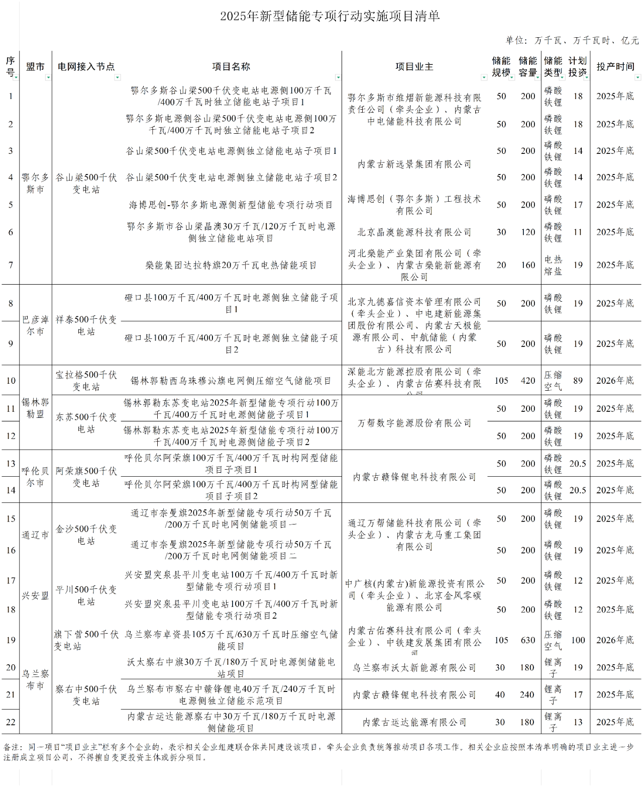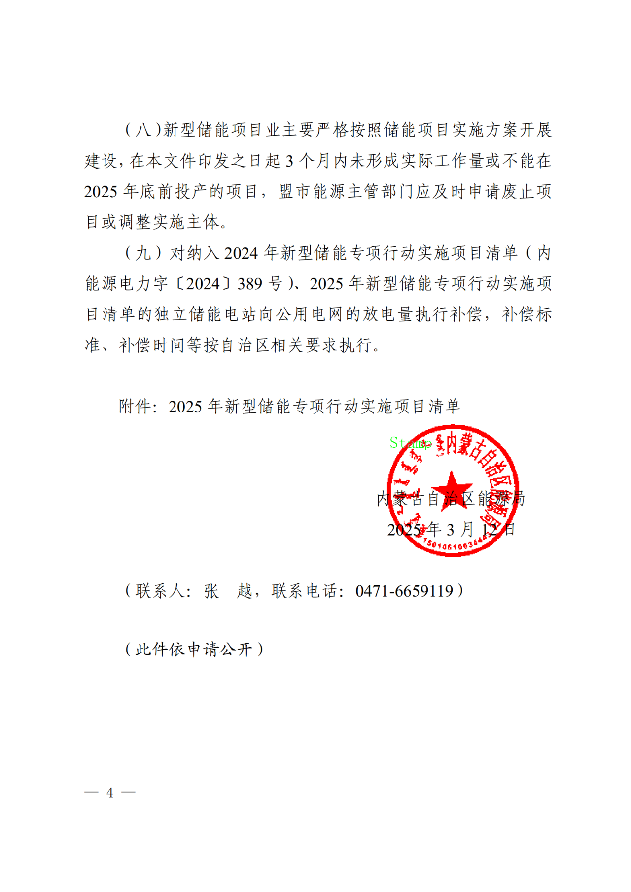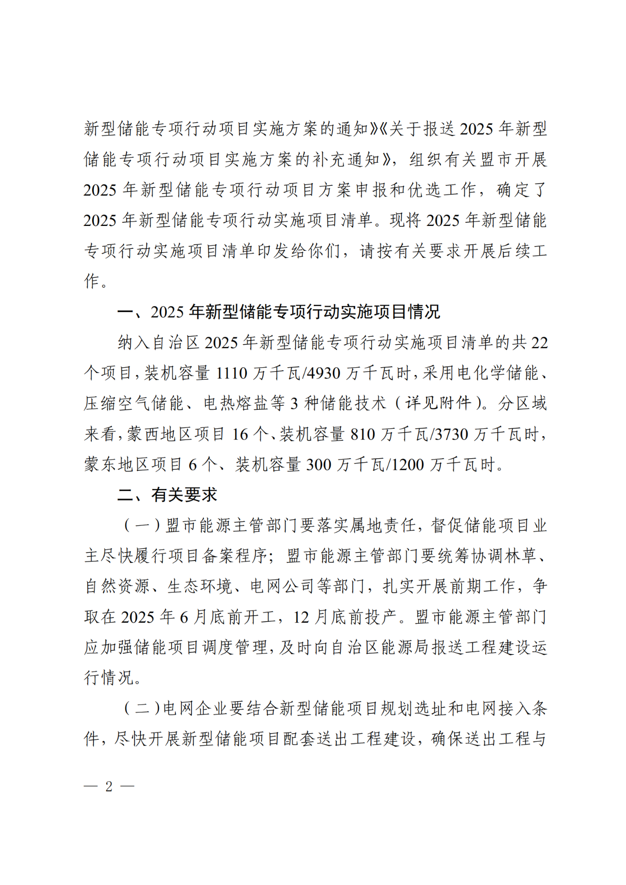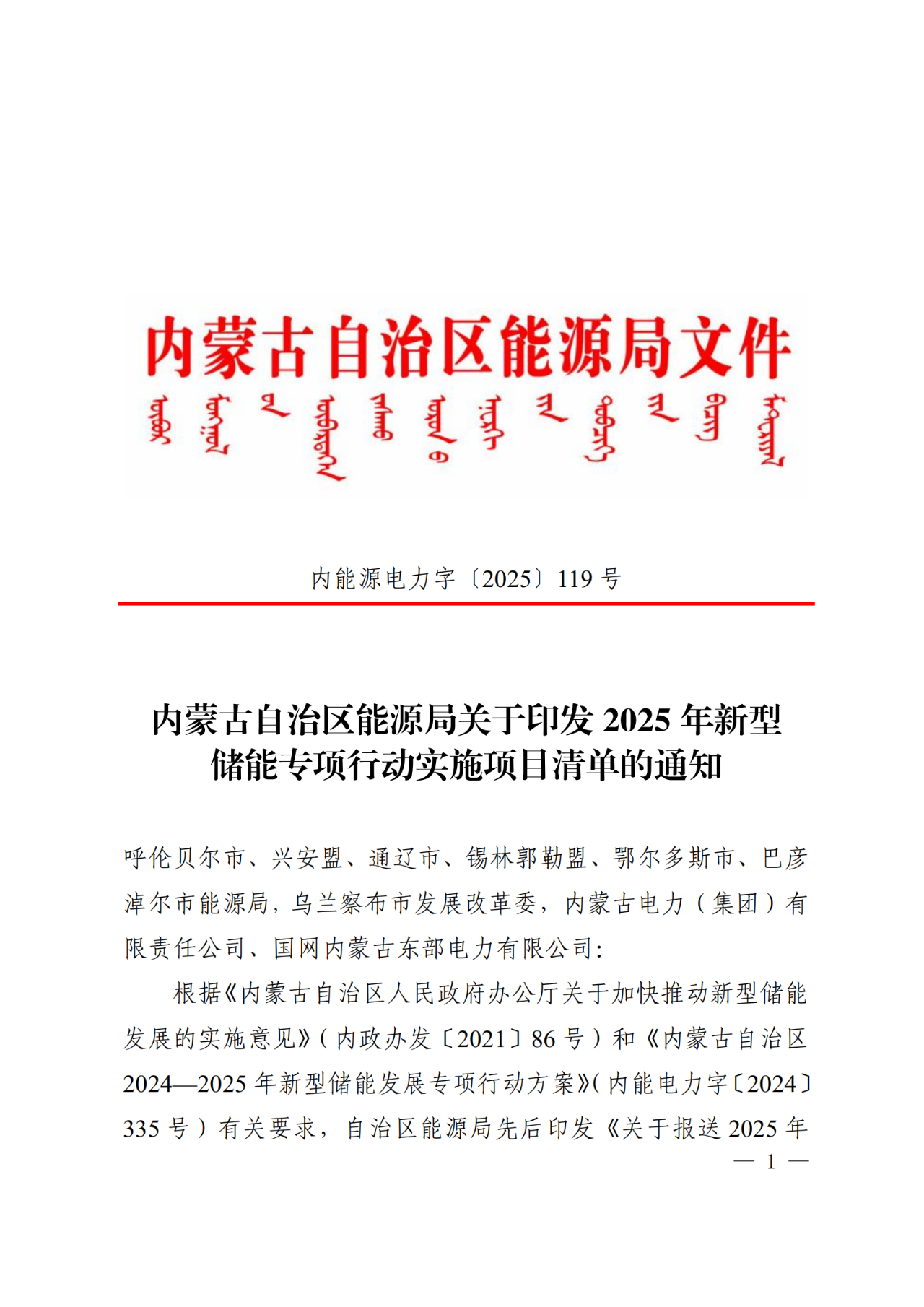 136號文在新能源、儲能行業(yè)引起軒然大波,對于新項目投資,大家紛紛進(jìn)入觀望,靜候省級政策出臺。3月12日,內(nèi)蒙古自治區(qū)能源局發(fā)布《關(guān)于加快新型儲能建設(shè)的通知》(內(nèi)能源電力字〔2025〕120號)以及2025 年新型儲能專項行動實施項目清單,以解決新能源、儲能這一對蹺蹺板平衡發(fā)展的難題,很好回答了136號文之后儲能發(fā)展問題。