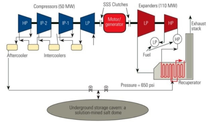 例如,阿拉巴馬州的McIntosh電廠由公用事業(yè)公司Power South擁有。它由一臺機(jī)械傳動鏈組成,包括兩臺西門子能源壓縮機(jī)和膨脹機(jī)、一臺電動發(fā)電機(jī)以及一個巨大的鹽穴。壓縮儲藏室約需40小時,之后發(fā)電機(jī)可滿負(fù)荷運(yùn)行約25小時。該機(jī)組能在9分鐘內(nèi)緊急啟動,且全年運(yùn)行。其動力傳動鏈由低壓(LP)、中壓(IP)和高壓(HP)壓縮機(jī)、低壓和高壓渦輪膨脹機(jī)以及SSS離合器制造的同步自換擋(SSS)離合器組成。離合器的接合或分離控制電動發(fā)電機(jī)是驅(qū)動壓縮機(jī)還是為電網(wǎng)發(fā)電。