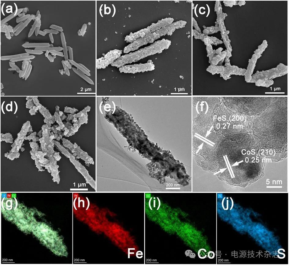 圖3(a)為前驅(qū)體MIL-88A的SEM圖,可以看出,未經(jīng)處理的MIL-88A前驅(qū)體表現(xiàn)出單分散的棱柱狀結(jié)構(gòu),這與文獻(xiàn)報(bào)道一致[24]。圖3(b)~(d)分別為樣品FC-2、FC-4和FC-6的SEM圖,可以看出,經(jīng)過后續(xù)離子交換和硫化處理,目標(biāo)樣品的表面變得較為粗糙。樣品FC-2和FC-4相對較好地保持了前驅(qū)體MIL-88A的棱柱狀結(jié)構(gòu),而樣品FC-6的棱柱狀結(jié)構(gòu)遭到破壞,且出現(xiàn)一定程度的團(tuán)聚。圖3(e)為樣品FC-4的TEM圖,可以看出,目標(biāo)樣品表現(xiàn)出小顆粒組裝成的柱狀結(jié)構(gòu),其長度約為2 μm。圖3(f)為FC-4的高分辨率透射電鏡圖(HRTEM)圖,可以觀察到晶格間距為0.27和0.25 nm的晶格條紋,分別對應(yīng)的是FeS2的(200)晶面和CoS2的(210)晶面[25-26]。此外,F(xiàn)eS2顆粒和CoS2顆粒界面緊密接觸,形成異質(zhì)結(jié),這對電化學(xué)儲鈉性能的提升是有利的[11,27-28]。圖3(g)~(j)給出了樣品FC-4的能量色散X射線譜(EDS)元素分布照片,可以看出,元素鐵、鈷和硫的分布完全一致,這一結(jié)果也很好地佐證了經(jīng)過離子交換過程,鈷離子進(jìn)入到了目標(biāo)樣品中。