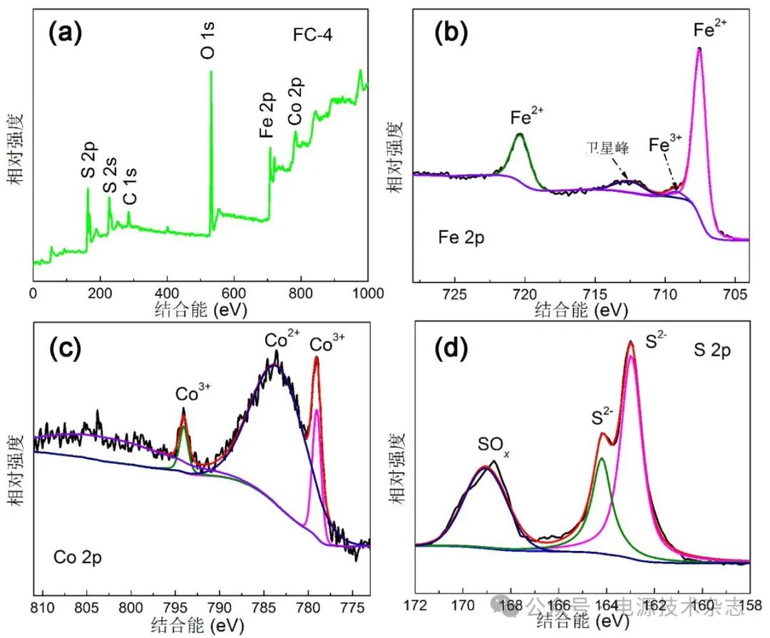 圖4 樣品FC-4的XPS圖譜(a)、樣品FC-4的Fe 2p高分辨圖譜(b)、樣品FC-4的Co 2p高分辨圖譜(c)以及樣品FC-4的S 2p高分辨圖譜(d)