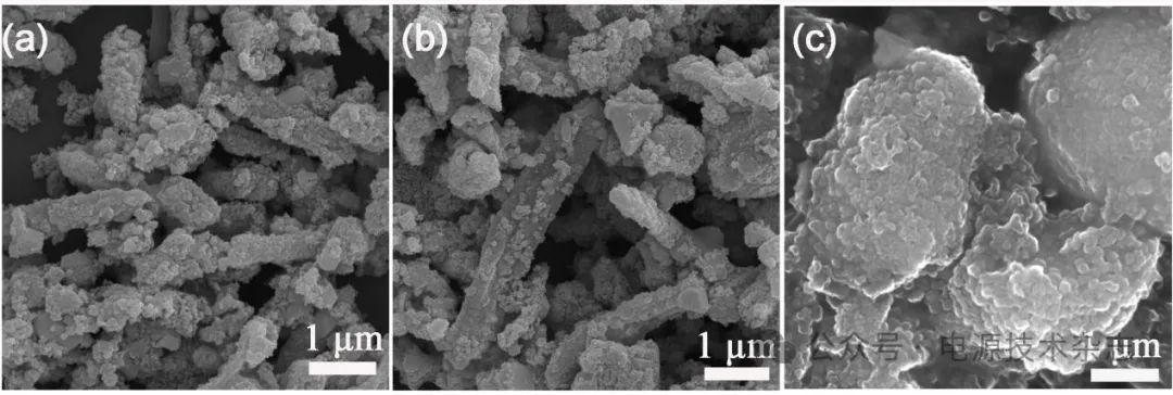 為直觀揭示樣品電化學(xué)循環(huán)性能的差異,表征了樣品在循環(huán)150次以后的SEM圖,如圖6所示,可以看出,樣品FC-2和FC-4循環(huán)后基本能夠保持原有的形貌,而樣品FC-6在循環(huán)后,其原有的棱柱狀結(jié)構(gòu)坍塌,同時(shí)活性組分出現(xiàn)團(tuán)聚,這與其電化學(xué)儲鈉性能迅速衰減直接相關(guān)[33]。