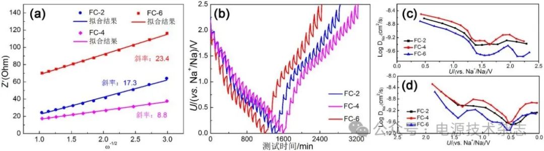 圖8 不同樣品的ZRe和ω1/2的線性關(guān)系(a)、GITT曲線(b)、充電過程(c)和放電過程(d)中的鈉離子擴(kuò)散系數(shù)