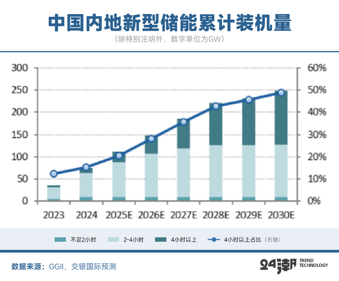 根據(jù)交銀國際分析,預計2025年起國內長時儲能市場將快速增長,到2025/2030年,4小時以上儲能占比分別提升至21%/50%,2025-2030年4小時以上儲能新增裝機規(guī)模合計超100GW。