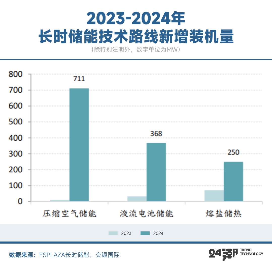 事實也確實如此。根據(jù)ESPLAZA長時儲能數(shù)據(jù)庫統(tǒng)計,截至2024年底,內地新型長時儲能累計裝機達2.3GW ,2024年實現(xiàn)新增新型長時儲能并網/投運裝機規(guī)模約1.3GW/8.1GWh。其中,壓縮氣體儲能新增裝機規(guī)模同比增長超70倍至711MW,容量占比約53%;液流電池增長超10倍至368MW,容量占比約28%;熔鹽儲能增長250%至250MW,容量占比約19%。