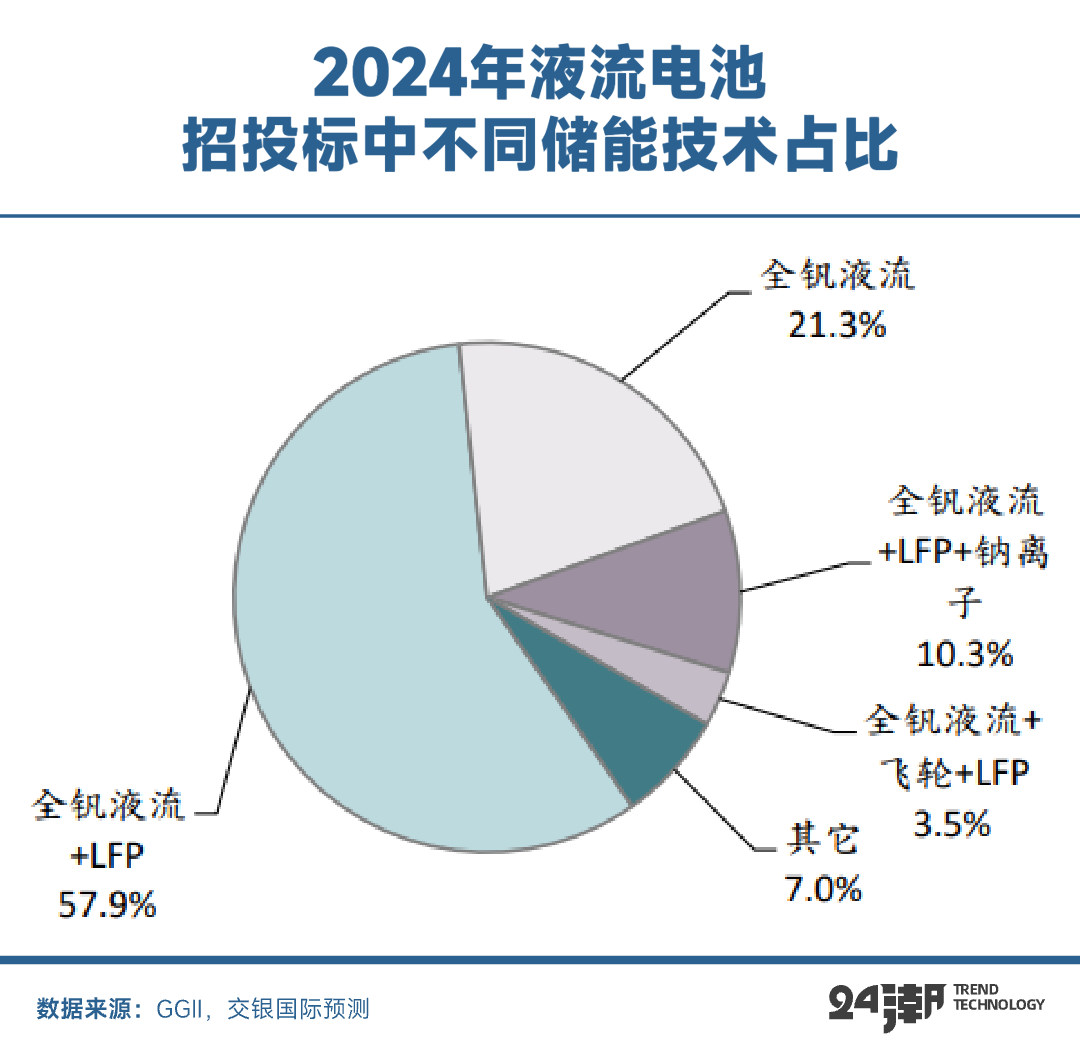 根據(jù)GGII數(shù)據(jù),2024年液流電池招投標超3GW,其中混合儲能占比超過71.8%。全釩液流電池+磷酸鐵鋰電池(LFP)混合儲能項目占比近六成,兩者結合后,既發(fā)揮液流電池長時儲能和高功率的特性,又借助磷酸鐵鋰電池提升整體能量密度,彌補了單一儲能技術在不同應用場景下的缺陷。