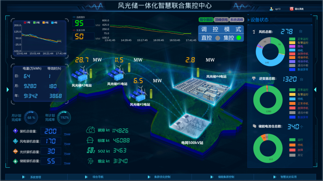 示范項目整體于2024年3月31日并網(wǎng)發(fā)電,其中:示范項目一期4號站于2021年12月底先行建成,現(xiàn)已安全穩(wěn)定運行超900天;二、三期1、2、3號站于2024年6月底實現(xiàn)全容量發(fā)電,共投運278臺風(fēng)機,1320臺光伏逆變器,340套儲能電池倉。