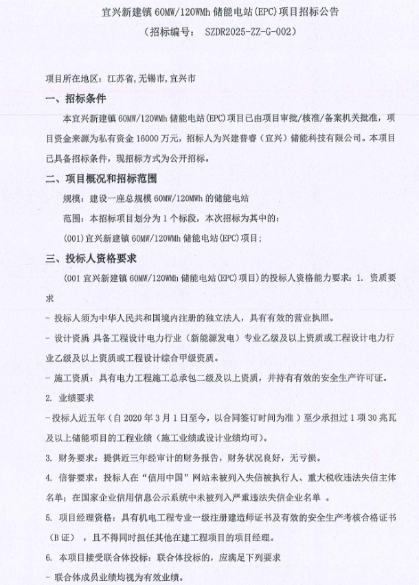中國儲(chǔ)能網(wǎng)訊:3月19日,興建普睿(宜興)儲(chǔ)能科技有限公司發(fā)布宜興新建鎮(zhèn) 60MW/120WMh 儲(chǔ)能電站EPC項(xiàng)招標(biāo),項(xiàng)目資金來源為私有資金16000萬元,約合1.33元/Wh。